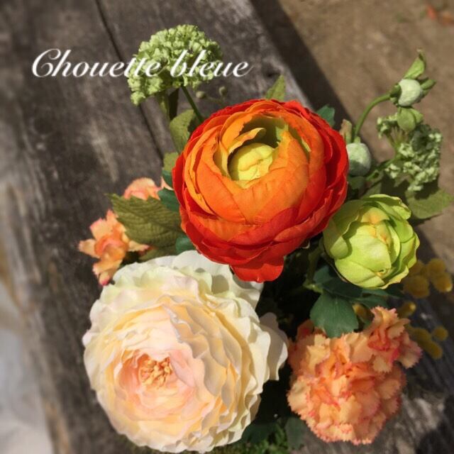 親しみやすく柔らかな表情を持つラナンキュラスと、明るく鮮やかなオレンジのラナンキュラスで変化をつけて、心が弾むようなリズムをイメージ♪